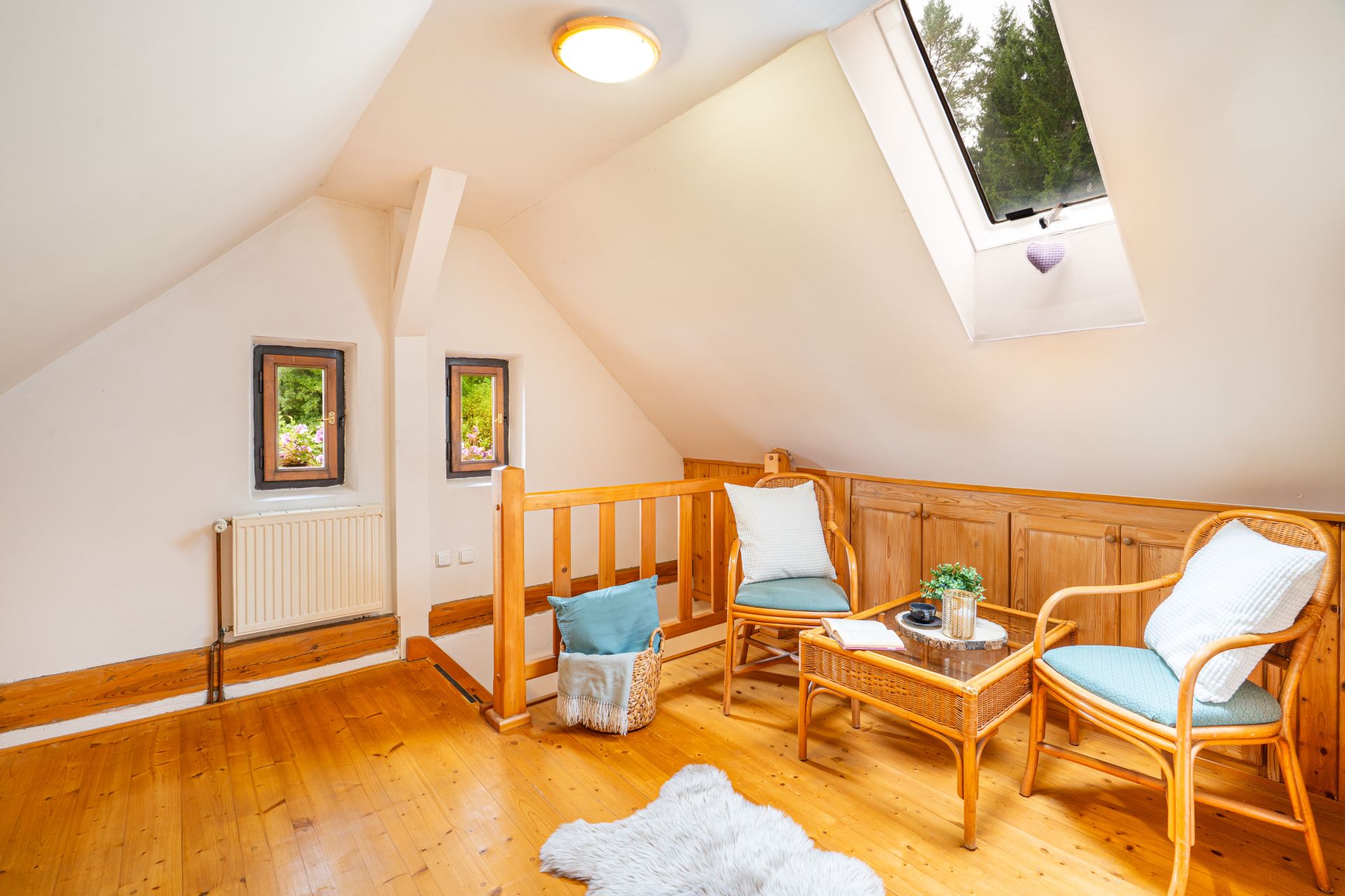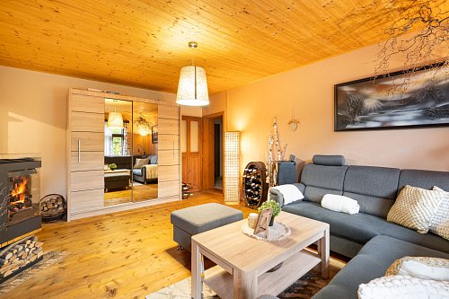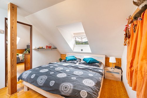 Dům je dispozičně řešen tak, aby poskytoval komfortní a praktické bydlení. V přízemí se nachází zastřešená veranda se vstupní chodbou, kuchyně, prostorný obývací pokoj s krbovými kamny, pokoj pro hosty, koupelna s vanou a WC, technická místnost a komora. Toto uspořádání umožňuje pohodlné každodenní fungování domácnosti a dostatek úložných prostor. V podkroví domu se nachází galerie, další pokoj, ložnice s lodžií a samostatné WC, což zajišťuje soukromí i komfort pro všechny členy rodiny.