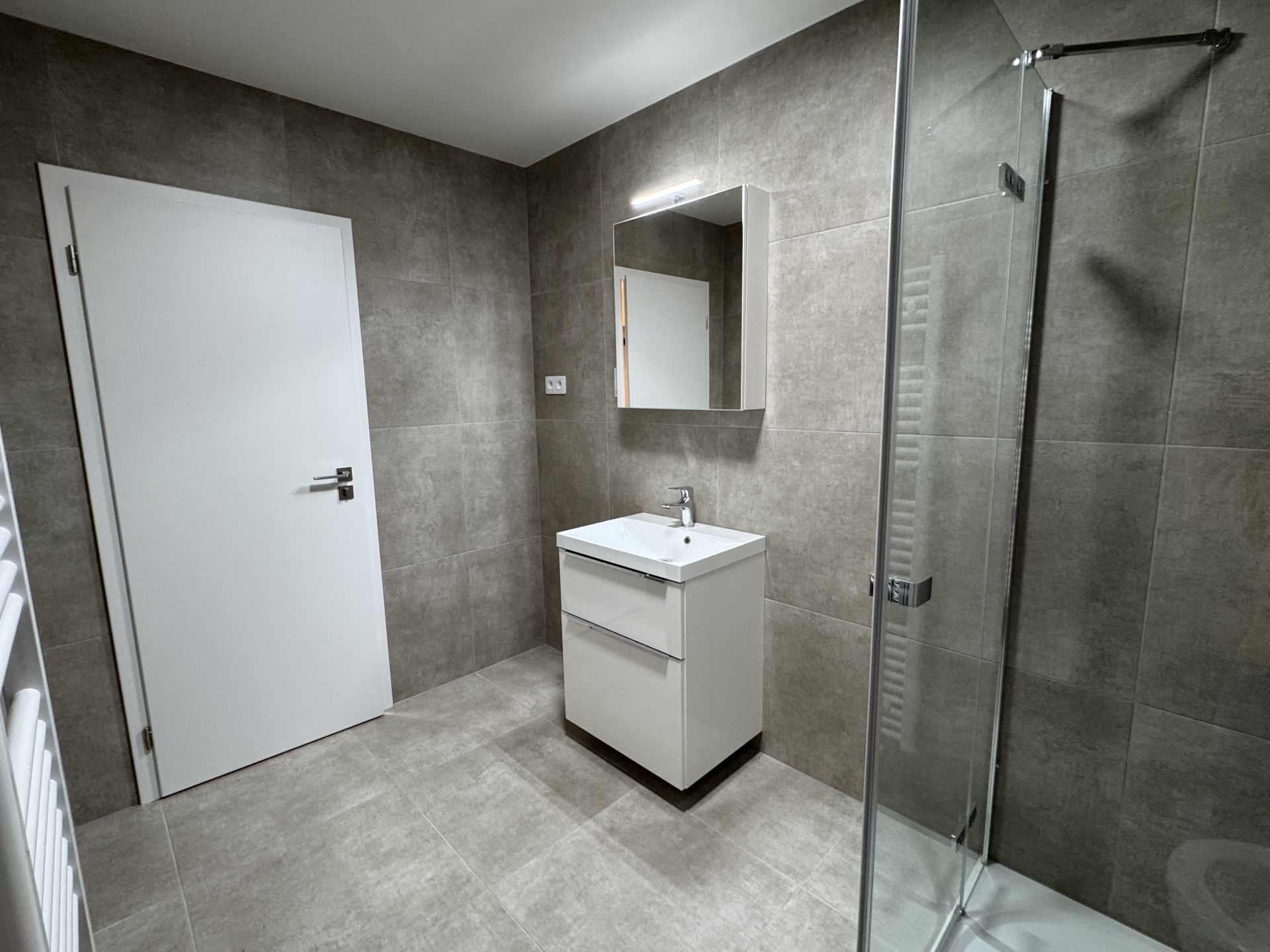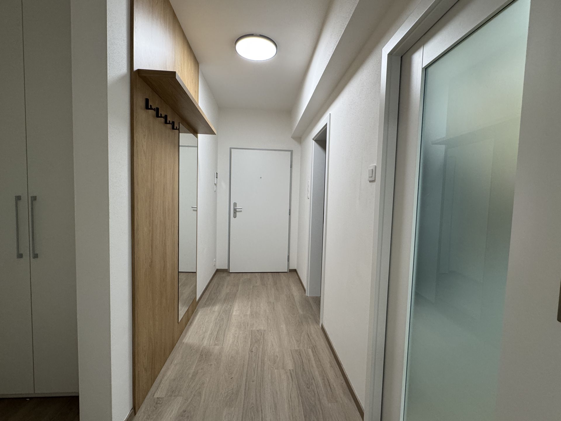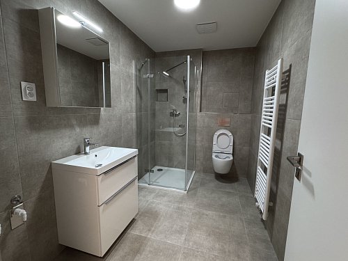 Interiér bytu je řešen promyšleně a s citem pro detail. Vstupní část nabízí vestavěné skříně s velkým úložným prostorem, díky nimž zůstává byt vzdušný a přehledný. Koupelna s toaletou o celkové výměře (5,73 m²) je plně vybavena sprchovým koutem, toaletou, zrcadlem s úložným prostorem a nabízí prakticky řešený prostor připravený pro umístění pračky.